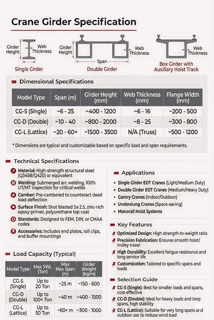 Crane girder includes overhead crane girder and gantry crane girder. Overhead crane girder has overhead crane single girder and overhead crane double girder. While gantry crane girder has gantry crane single girder, gantry crane double girder and gantry crane truss girder.