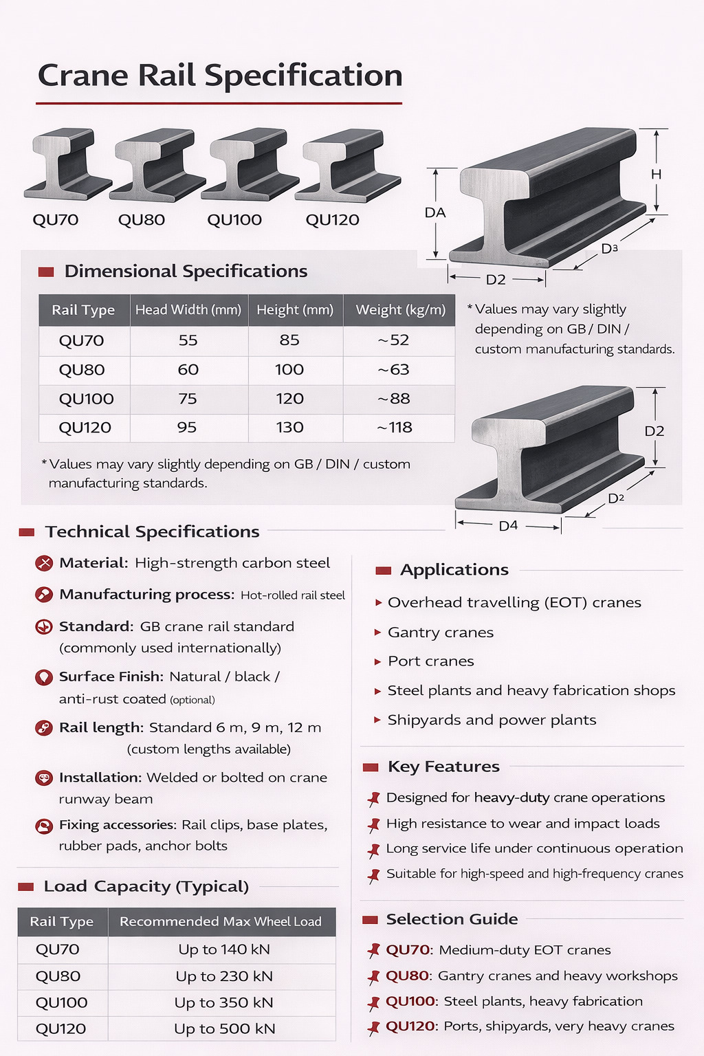 Crane rail supplier for overhead crane and gantry crane. Dongqi Group supplies you crane rail and crane rail installation service. Contact us to get cranes and crane spare parts that you need.